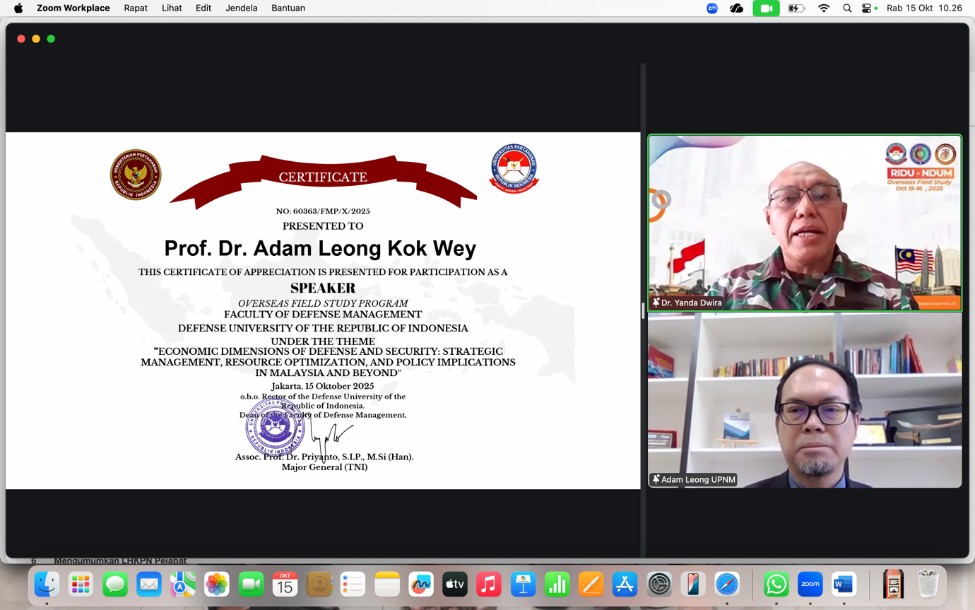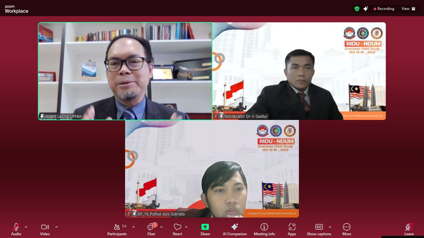 Jakarta, Prodi Ekonomi Pertahanan, Fakultas Manajemen Pertahanan, Universitas Pertahanan Republik Indonesia (Unhan RI), menggelar Kuliah Kerja Luar Negeri bertema “Economic Dimensions Of Defense And Security: Strategic Management, Resource Optimization, and Policy Implications in Malaysia and Beyond”. KKLN ini dibuka secara resmi oleh Dekan Fakultas Manajemen Pertahanan Unhan RI, Mayjen TNI Dr. Priyanto, S.IP, M.Si (Han), pada Hari Rabu (15/10). Bertindak sebagai moderator dalam diskusi ini adalah Kol Art Dr. Guntur Eko Saputro, S.I.P., M.M dosen tetap Fakultas Manajemen Pertahanan RI. KKLN yang dilaksanakan dibagi menjadi 5 sesi dimana pada sesi pertama menghadirkan narasumber dari National Defence University Of Malaysia Professor Dr. Adam Leong Kok Wey yang merupakan Professor of Strategic Studies & Director, Centre for Defence and International Security Studies, NDUM.